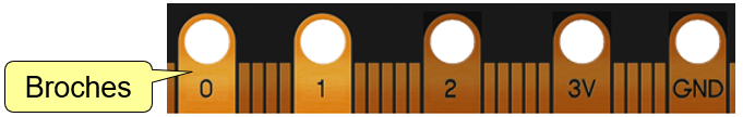 En plus de ses deux Boutons Poussoirs (A et B) et de son petit écran constitué de 5 x 5 LED rouges, la carte « micro:bit » possède un certain nombre de broches numérotées servant à y connecter soit des capteurs (détecteur de présence par exemple) soit des actionneurs (moteur par exemple)